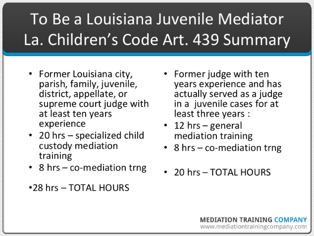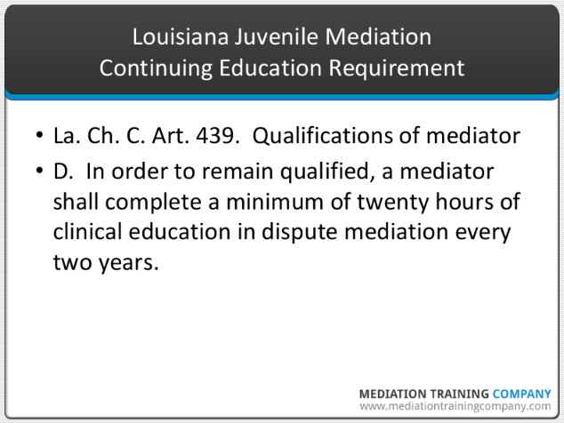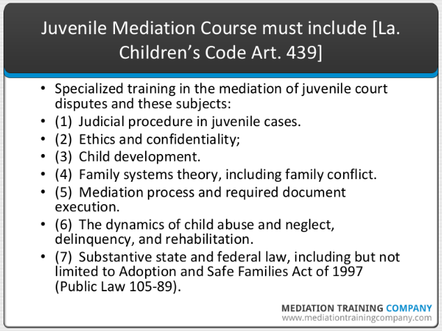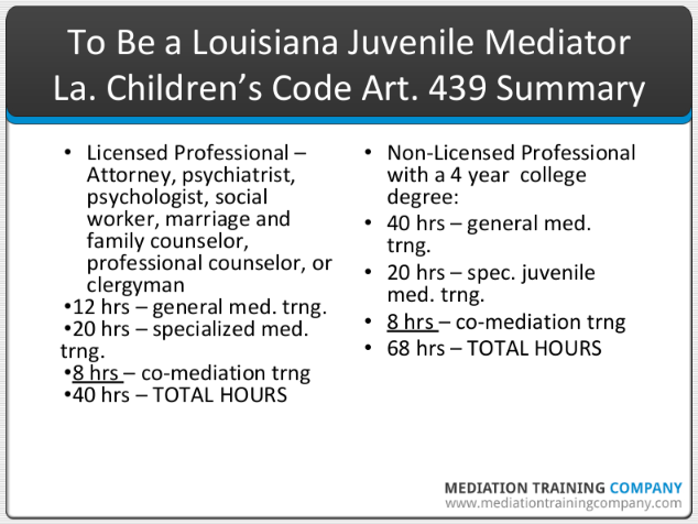 To ensure that your mediation training complies with Louisiana law, you might wish to receive training approved by the LSBA ADR Section, the entity that maintains the three mediation registers in Louisiana. If you believe that you are sufficiently qualified to mediate juvenile disputes in Louisiana because of your mediation training and/or experience in another state, you might consider petitioning the LSBA ADR Section for approval to be a qualified family child custody and visitation mediator in Louisiana. You can call the Louisiana Bar Center at 504-566-1600 and ask for the contact information for the section chair.