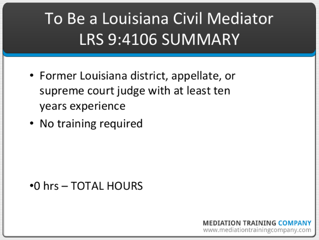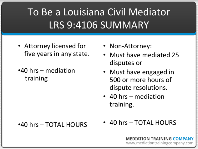 To become a civil mediator in Louisiana, there are no specific qualifications that must be met. In other words, the private practice of mediation in Louisiana is not regulated. Therefore, if you want to become a mediator today, there is no impediment - you need to simply convince other people that you have a skill set that will benefit them.