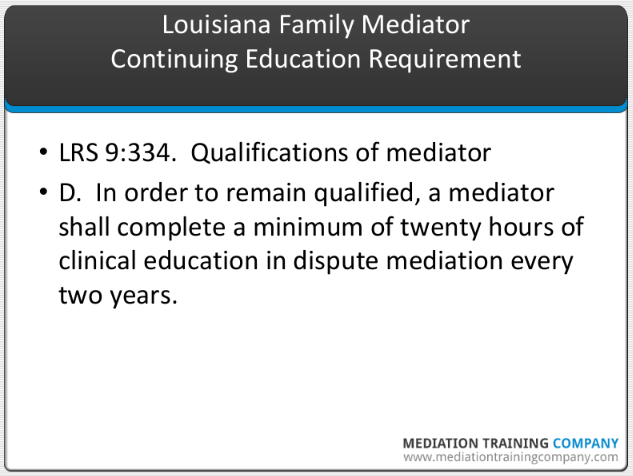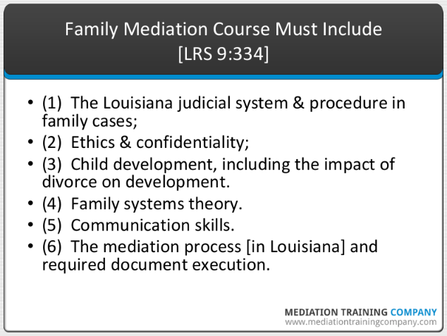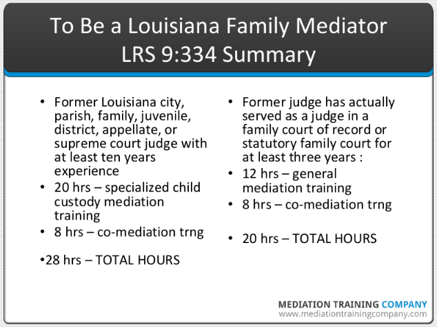 Unlike civil mediation in Louisiana, which is not regulated, the qualifications of mediators of family child custody and visitation disputes in Louisiana are regulated by LRS 9:334. That means that if you want to mediate those types of disputes, you must obtain mediation training that includes the substantive areas detailed in the mediator qualifications statute, LRS 9:334.