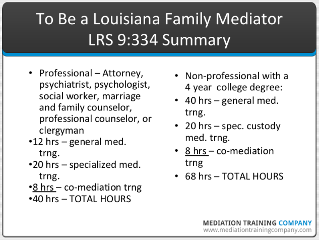 If you are a professional coming from another state and/or you have received mediation training in another state, and you want to be a Louisiana family mediator and mediate child custody and visitation issues, you need to meet the training requirements of LRS 9:334. The statute is summarized below.